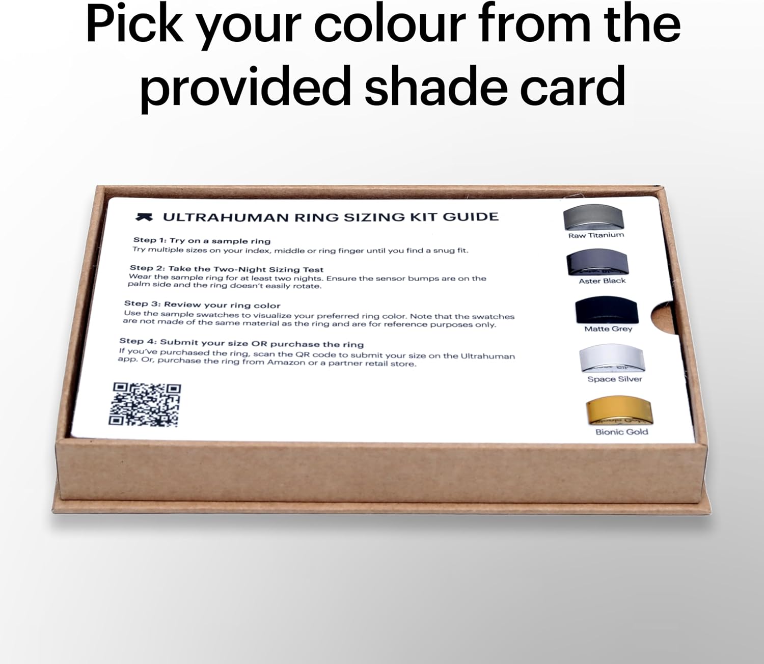 Kad esat noteicis savu izmēru, izvēlieties sev piemērotāko krāsu, izmantojot izmēra noteikšanas komplektā esošo krāsu paraugu karti. Pieejamas 5 krāsas: Aster Black, Space Silver, Bionic Gold, Matt Grey un Raw Titanium. Atrodiet krāsu, kas vislabāk atbilst jūsu stilam.